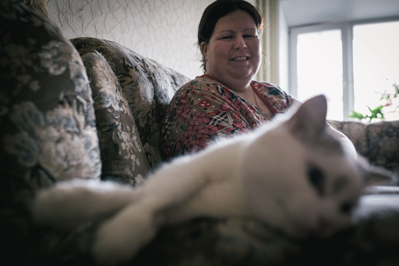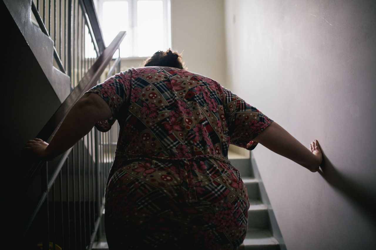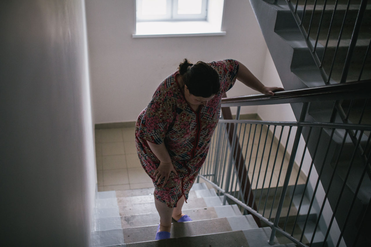 Настя часто ходит по лестнице, нагружая больную ногуФото: Вадим Брайдов для ТД Настя живет с мамой, сестрами Ксюшей и Наташей, Наташиным мужем и тремя котами в новой трехкомнатной квартире — по местным меркам это настоящие хоромы. К Насте мы приехали с Аленой, они здороваются как старые подруги. «Я не думала, что все так обернется, — улыбается Настя, она вообще все время улыбается. — Думала, полежу в реанимации с недельку, встану и пойду. Выздоровею, на работу выйду. Ха-ха. Кто знал? Оно по-другому все вышло. Уже второй год, считай. Я еще и вес набрала с этой болезнью, больше, чем надо. Сама виновата, конечно, если бы не вес, так, может быть, уже бы и бегала. Когда штормит, могу упасть, страшновато все равно. Стараюсь без палочки, без всего ходить. Но если бы не Ирина с Аленой, то я бы и не встала никогда. Погибла бы я».