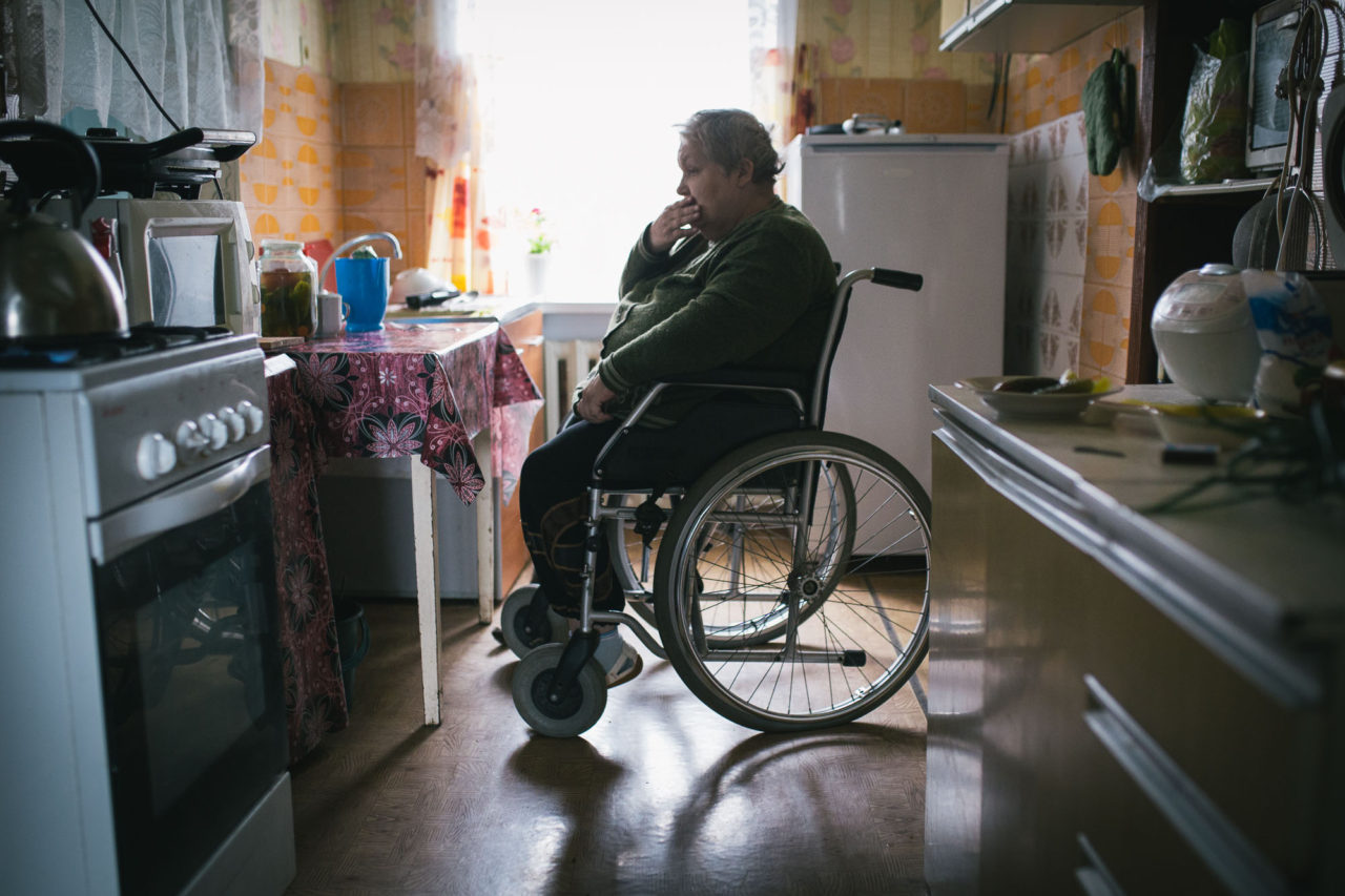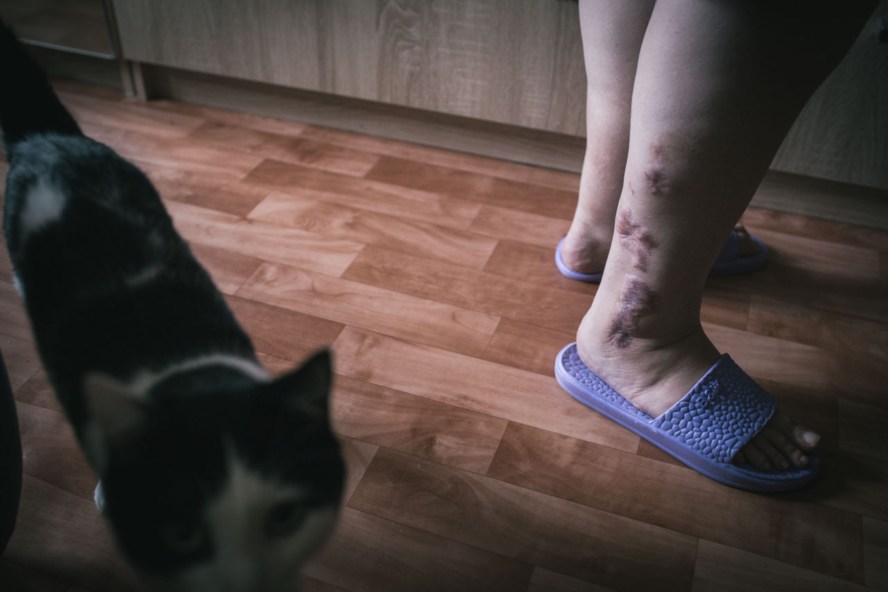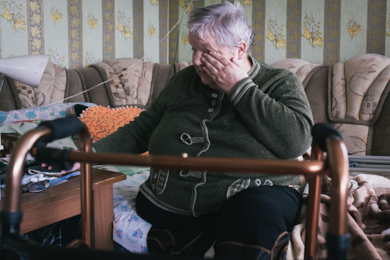 «Проблема у меня возникла — я поменяла колено. Сустав коленный, мне его поставили инфицированный, больной, сразу больной поставили. Здесь все написано, я вижу все хорошо, но понимать — ни черта не понимаю. Мне пять операций сделали, а итог такой, что я осталась инвалидкой. Вот я должна учиться ползать. Но я уже три раза, ползая, упала вся в синяках. Недавно еще упала. Пошла на костылях, наступила на мокрое. Все было хорошо, а потом ка-а-ак на это место. Да сознание потеряла. Приползти — приползла, а как встать? Надо же пять человек, чтобы меня, такую корову, поднять. Велели мне ползать. Вот, садись на попу и ползи. С коляски тоже падала. Три раза там перевернулась через коляску задницей кверху. Один раз это ладно, там люди яму рыли для туалета, услышали, что я заорала, подняли меня, закинули сюда. Потом, значит, один раз я перевернулась опять там же, но была Оксанка дома, в огороде, окошко открыто, с Иринкой затащили. Три раза упала, разбилась.