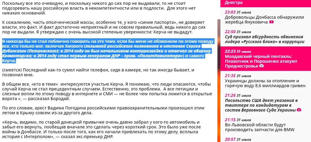 Волнение Хмурого особо подчеркивает даже лидер ветеранской организации «ополченцев» Александр Бородай. В интервью изданию «Политнавигатор» он рассказал об опасениях товарища и других «ополченцев», «чтобы случай Керча не стал прецедентным». В том же интервью Бородай успокоил единомышленников, заявив, что «не стоит подозревать нашу российскую власть в некомпетентности или подлости… Факт [задержания] достаточно неприятный и не совсем правильный, ведь никого до сих пор не выдали. [Но] я утверждаю с очень высокой степенью вероятности: Керча не выдадут».