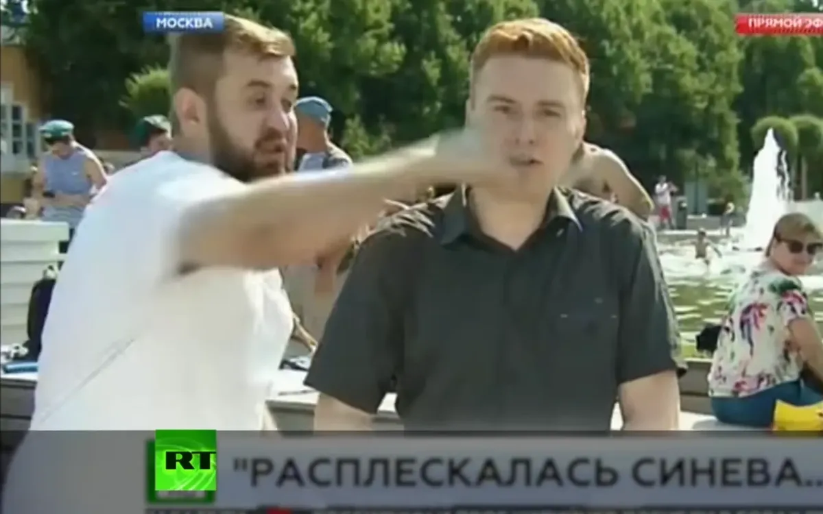 Вовсе не в Ленинграде-городе, а в столице нашей Родины Москве, и не у Пяти углов, а в Парке Горького «получил по морде» корреспондент НТВ Никита Развозжаев. Он едва начал прямое включение с традиционного праздника купающихся в фонтанах десантников, в кадре повис песенный заголовок сюжета «Расплескалась синева», ведущая программы «Чрезвычайное происшествие», подводя к сюжету, поэтично назвала этих доблестных воинов «крылатыми гвардейцами», а Никита с воодушевлением поведал, что никто, кроме них, так не отмечает свой праздник, «элитные войска, как их не зря называют», как в кадр, шатаясь и грязно матерясь, ввалился бородатый тип, а на просьбу журналиста помолчать, с ходу вломил тому в челюсть. «Сука, захватим Украину», — успел еще выкрикнуть он, после чего, продолжая изрыгать угрозы, поплелся прочь.