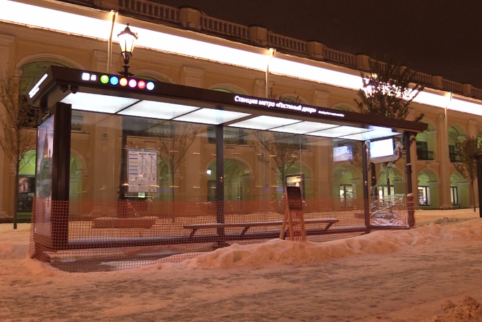 Пока в городе есть только одна «умная» остановка: она появилась осенью 2016 года у метро «Гостиный двор». На ней находится встроенное информационное табло с отображением времени ожидания транспорта, точка доступа к сети Wi-Fi, USB-порт для подзарядки гаджетов и встроенное светодиодное освещение внутренней площадки павильона.