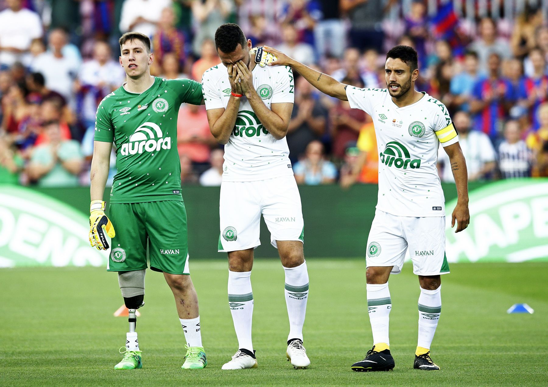Manu Fernandez / AP / Scanpix / LETA Самолет с футбольным клубом «Шапекоэнсе» потерпел катастрофу в ночь на 29 ноября 2016 года. Выжили лишь трое футболистов — Джексон Фольман (слева), Элио Нето (в центре) и Алан Рушель. 7 августа заново собранная команда «Шапекоэнсе» провела благотворительный матч с «Барселоной» в Испании.