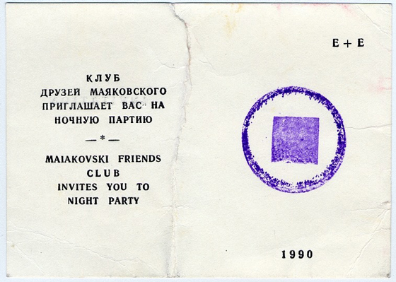 Билет на первую «Ночную партию» в России с печатью Клуба друзей Маяковского. 1990 Цены стали падать, поползли слухи, что, заплатив определенную сумму, можно получить подтверждение подлинности, стали множиться «эксперты и специалисты», между ними начались разлады и ссоры — прямо как в эпизоде «Золотого теленка» Ильфа и Петрова, где описываются «дети лейтенанта Шмидта».
