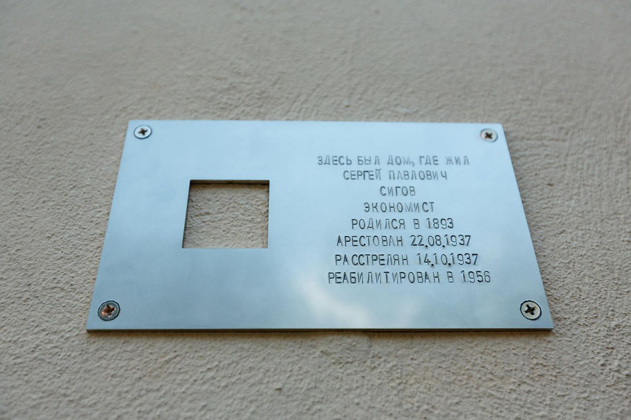 It took the collective effort of five people to get the memorial plaque installed outside the home on 75 Decembrists Street: one person hit the archives to determine the exact location of the Opytstroi co-opt buildings; another person worked in the library, studying Sigov’s scientific writings, and interviewed his living relatives; and others made contact with the homeowners of the building that now exists where Sigov’s apartment once stood. It took almost a year to convince the homeowners to grant them permission to install the plaque.