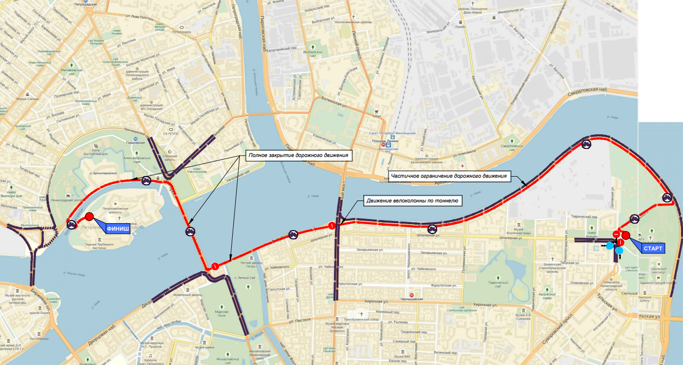 С 10:00 до 11:00 движение остановят на площади Растрелли. Движение также ограничат по ходу движения колонны участников велопробега — с 11:00 до 12:00 по улице Смольного, Смольной набережной в направлении к Воскресенской набережной, Воскресенской набережной в направлении к набережной Кутузова, набережной Кутузова, Дворцовой набережной на участке от набережной Фонтанки до Троицкого моста, по Троицкому мосту, а также по Кронверкской набережной.