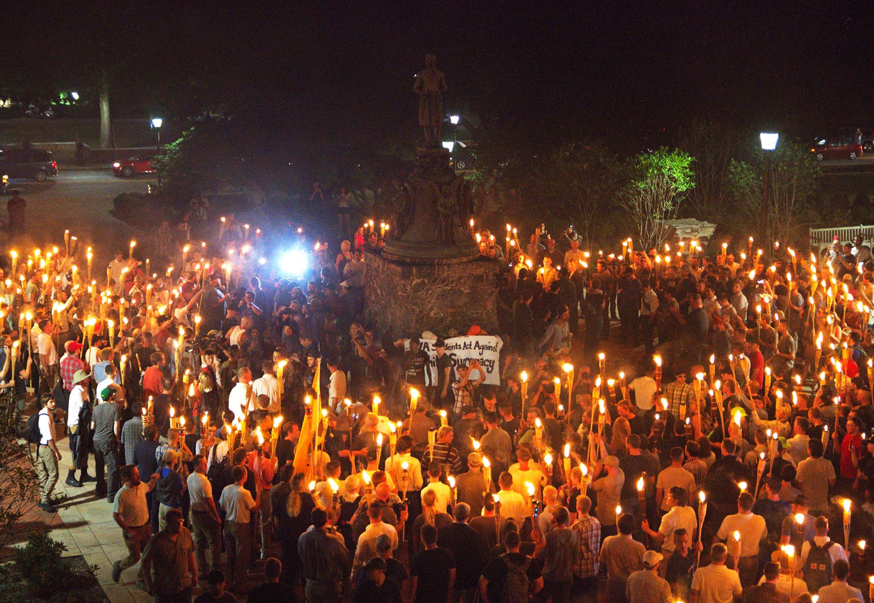 Alejandro Alvarez / News2Share / Reuters / Scanpix / LETA Ультраправые активисты возле памятника Томасу Джефферсону в кампусе Университета Виргинии в Шарлотсвилле. Они собрались в городе, чтобы протестовать против планов городских властей снести статую генерала армии конфедератов Роберта Ли. 11 августа несколько сотен активистов прошли с факелами по территории кампуса, скандируя расистские лозунги. Их встретила небольшая группа противников, начались стычки, и полиция прервала шествие. 12 августа из-за столкновений в Виргинии объявили чрезвычайное положение. Позже в толпу демонстрантов врезался автомобиль; погиб 1 человек, 19 пострадали. Шарлотсвилл (Виргиния), 11 августа 2017 года.