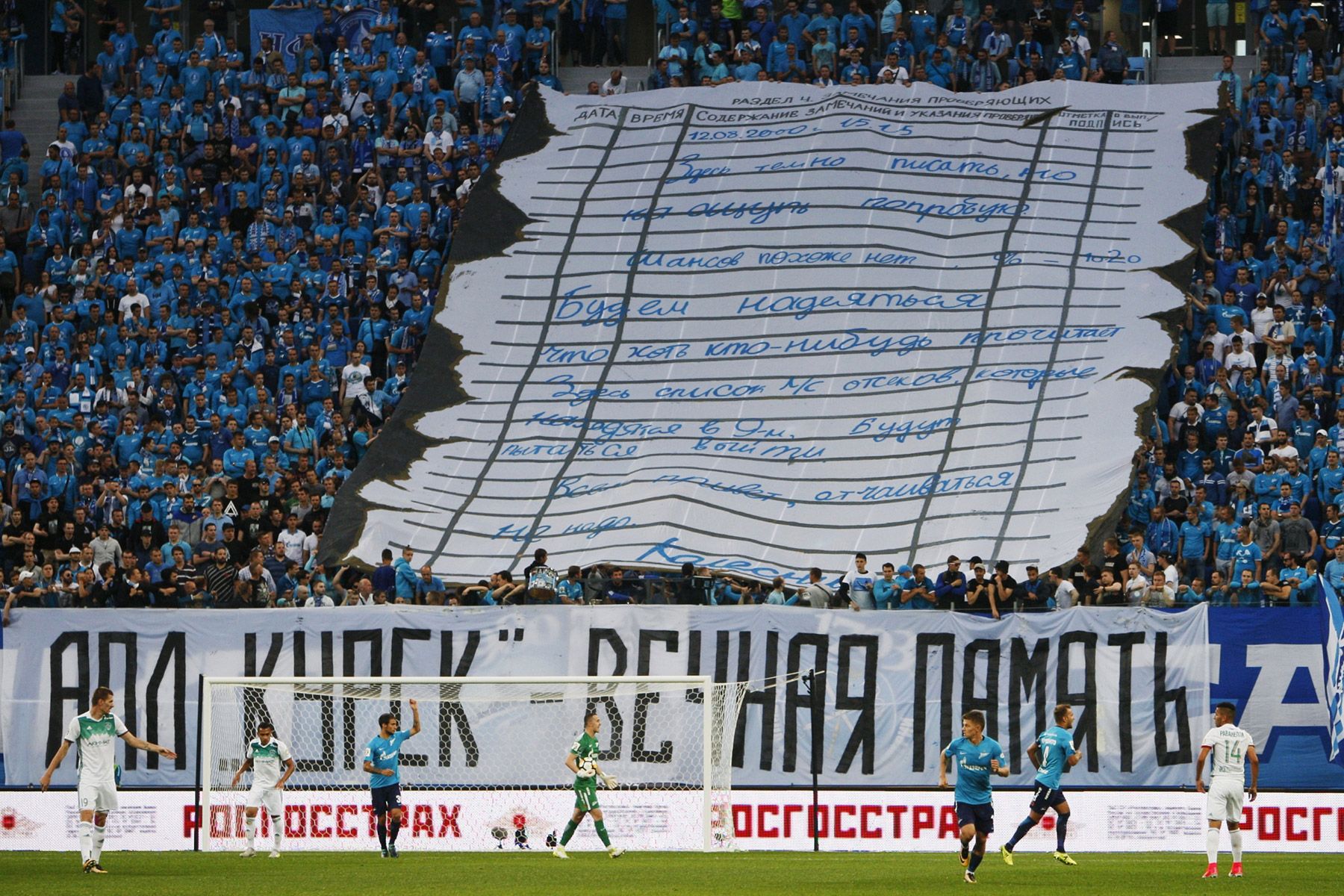 Михаил Киреев / Sputnik / Scanpix / LETA Болельщики «Зенита» на матче с «Ахматом» вывесили баннер в память экипажа подлодки «Курск», затонувшей 12 августа 2000 года. На трибунах была развернута копия прощальной записки, оставленной капитаном Дмитрием Колесниковым. В результате аварии «Курска» погибли все 118 человек, находившиеся на борту подлодки.