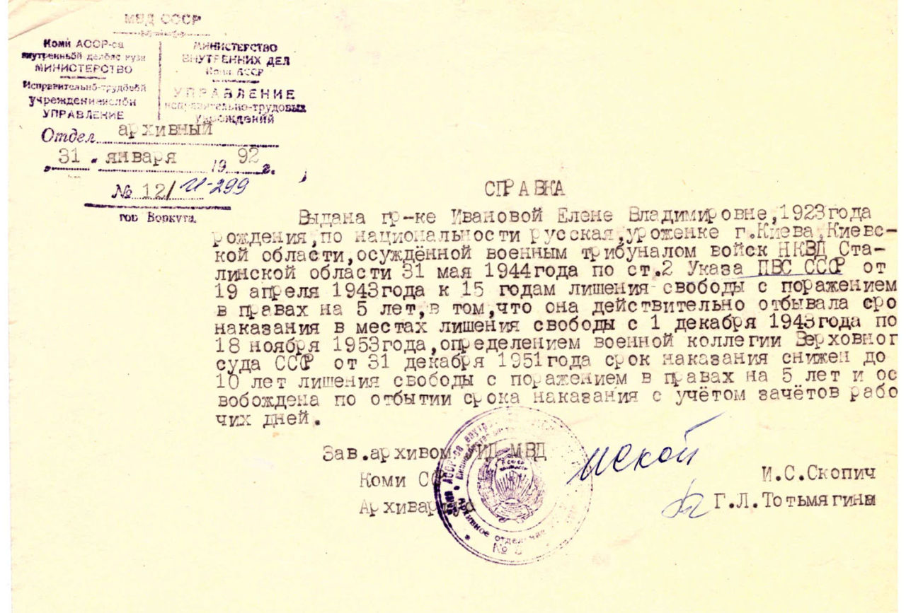 В июне 1944 года, после месячного путешествия из тюрьмы города Сталино, Лена прибыла в пересылочный лагерь в Котласе.