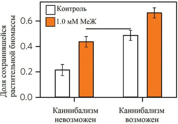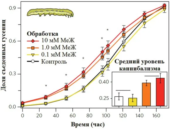 Если рядом находятся такие свежие, аппетитные гусеницы, как же их не есть! И живые совки их лопали и на контрольных листьях, и на обработанных метилжасмонатом. Но в контрольных чашках они еще и зеленью питались, и за двое суток уничтожили изрядное ее количество (рис. 3). Зато на обработанных листьях гусеницы почти не трогали невкусную растительность, пробавлялись каннибализмом и нормально при этом развивались. Если же другой пищи, кроме обработанных листьев, не было, приходилось довольствоваться ими, и вредители их основательно попортили. Однако листья эти не питательны, отчего гусеницы практически не росли.