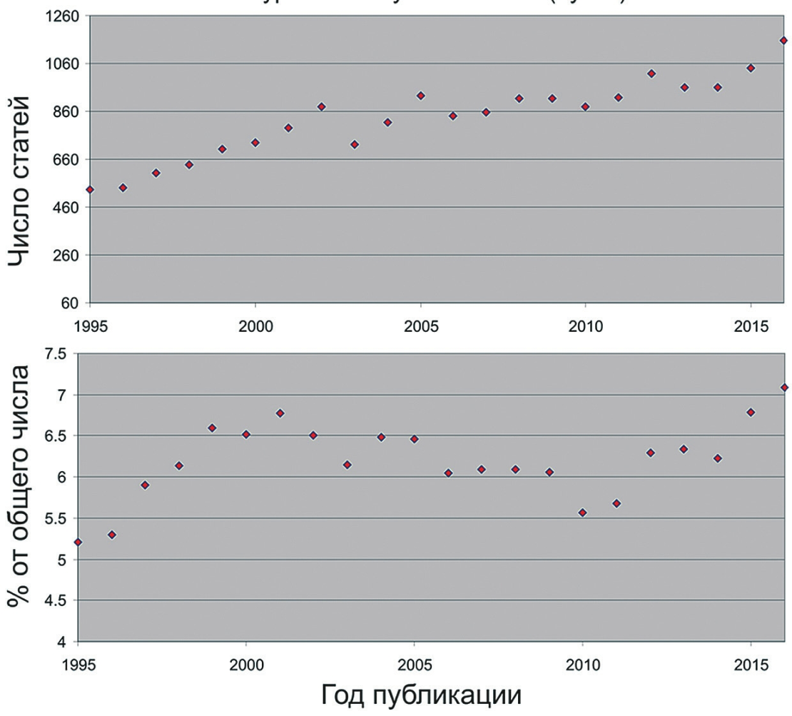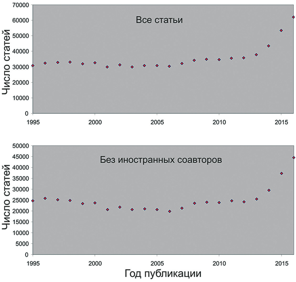 В общем, видно, что российские ученые стали заметно больше публиковаться, в том числе в престижных научных изданиях. Что же послужило этому толчком? На рубеже 2010-2013 годов произошло много событий. В 2010 году — запущена программа мегагрантов с привлечением в страну (преимущественно) иностранных ученых под большие деньги (www.p220.ru). В 2011-м — создан Сколковский институт науки и технологий (www.skoltech.ru). В 2012-м — начат проект «5-100» по финансированию 21 университета для вхождения пяти из них в первую сотню согласно международным рейтингам (http://5top100.ru). В 2013 году — объявлено о создании Российского научного фонда (http://рнф.рф). Несмотря на то что иногда финансирование через эти программы напоминало перенос воды в решете, вероятно, весь этот комплекс мероприятий, в условиях исходно низкой базы, в итоге дал кумулятивный эффект, который и привел к заметному росту публикаций.