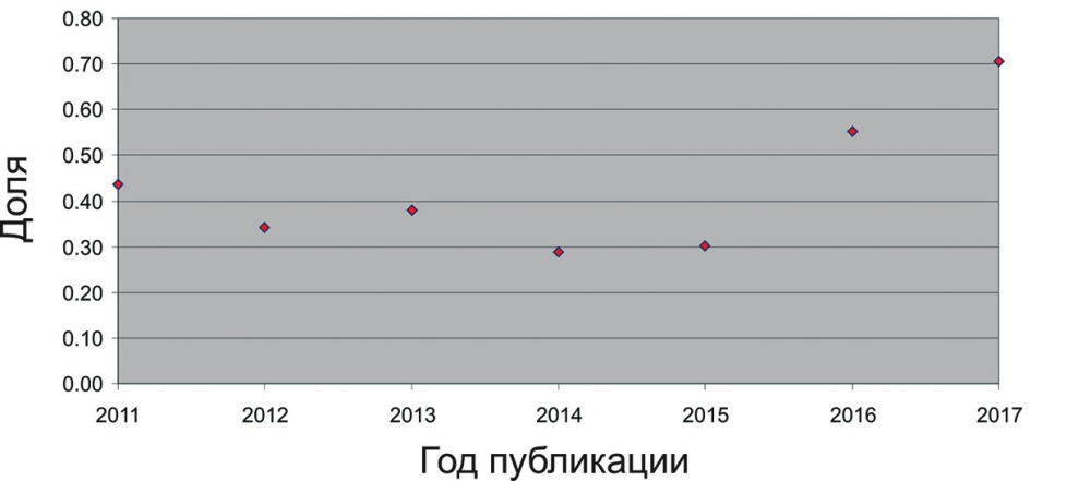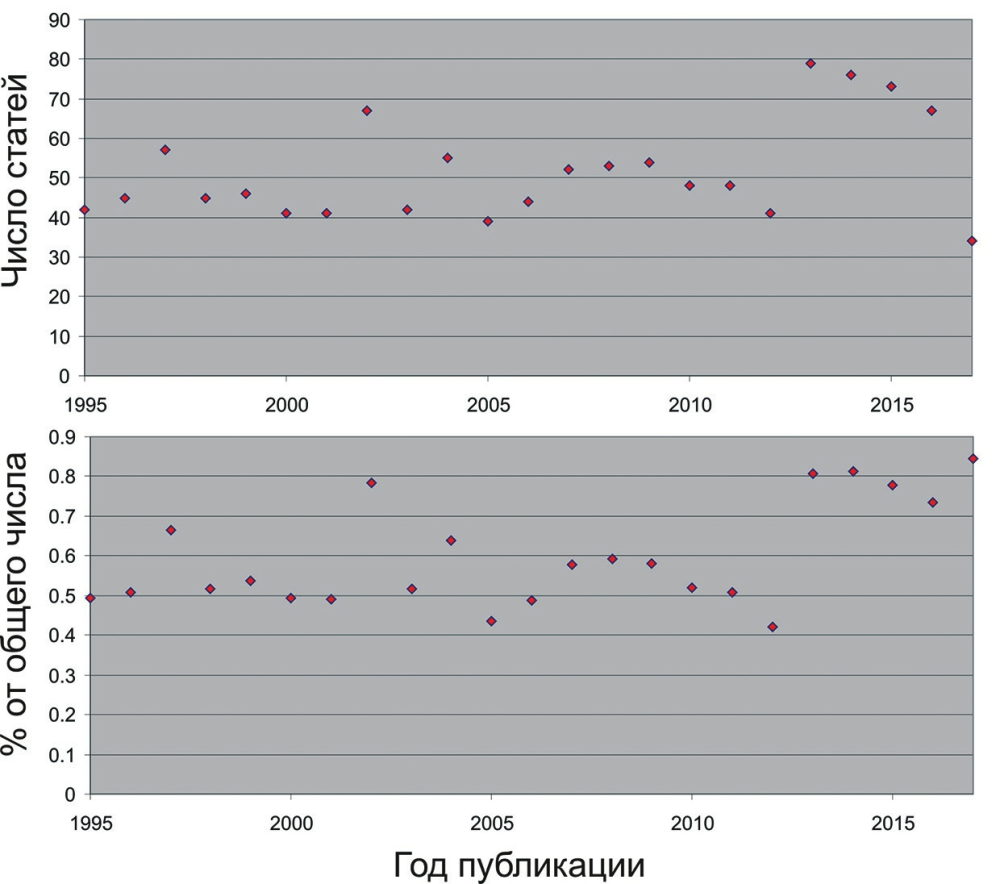 Интересно также, что доля статей в этих трех журналах с указанием российского источника финансирования только в последние годы превысила половину от общего числа опубликованных статей с российскими авторами (рис. 4). Это, по-видимому, говорит о том, что только в последние годы в этих статьях появился реальный вклад российского финансирования, тогда как раньше исследования, результаты которых публиковались в наиболее престижных изданиях, преимущественно выполнялись за счет источников иностранных соавторов.