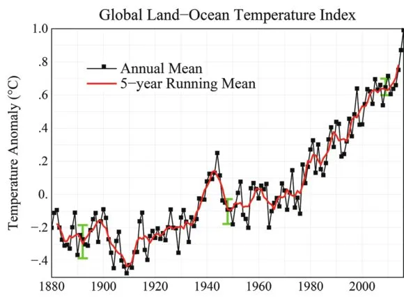 Температуру поверхности Земли начали изучать по единой методике с cередины 1980-х годов в Институте космических исследований Годдарда (Goddard Institute for Space Studies, GISS) [18]. Независимо ни от каких годовых колебаний общий тренд с тех пор неизменен: средняя температура поверхности нашей планеты растет, что хорошо видно на иллюстрации по ссылке [19] (см. рис. 2).