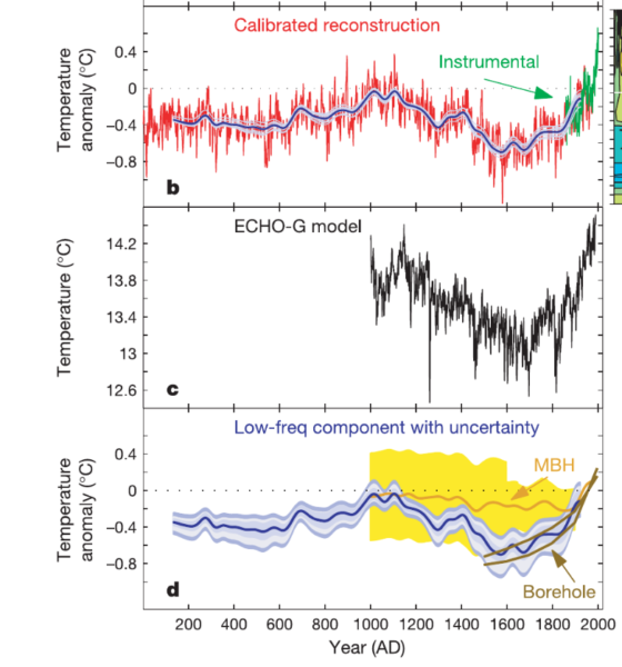 Вы приводите серию иллюстраций. Ваша картинка «б», «адаптированная из Moberg et al., 2005», не соответствует оригиналу. Вот скриншот (рис. 1) прямо из статьи Моберга и др. (9) (секция (b) показывает температуру, шкала времени внизу по оси X).