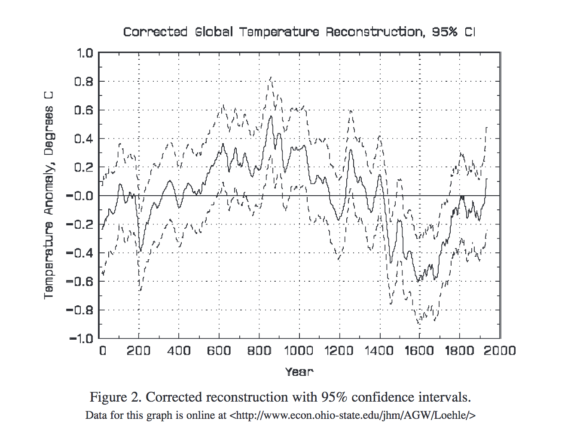 За этим тоже стоит печальная история. Лоэль (Loehle) опубликовал в 2007 году свою реконструкцию температуры по данным, «не связанным с годовыми кольцами деревьев» (10). Именно она показана на Вашем рисунке «в». На ней температура MWP получалась на +0,6 °C выше, чем в современном потеплении, которое он дотягивает до 2007 года. Практически сразу же ему пришлось сделать поправки, поскольку коллеги обнаружили, что он неправильно перевел шкалу BP в календарную и сделал другие ошибки в расчетах. Температура опустилась до 0,5 °C (здесь рис. 2), и Лоэль заметил, что хотя ошибки в расчетах и были, но на основные выводы его труда они не повлияли (11).