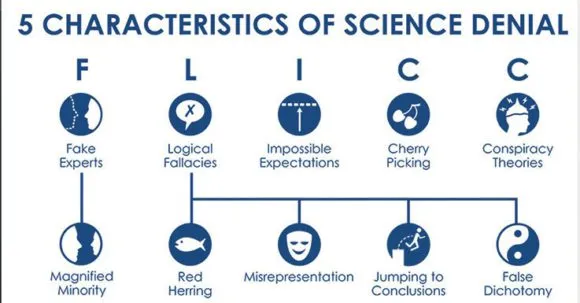 F — псевдоэкспертиза: ее логическим развитием (нижний ряд) становится «преувеличенное большинство» сторонников отрицания; L — ложное умозаключение; I — невозможное предположение; С — подтасовка фактов; и C — теория заговора. Самым мощным методом становится L — ложное умозаключение, со множеством разновидностей: использование отвлекающего маневра, введение в заблуждение, скоропалительные выводы и ложное разграничение [связанных явлений].