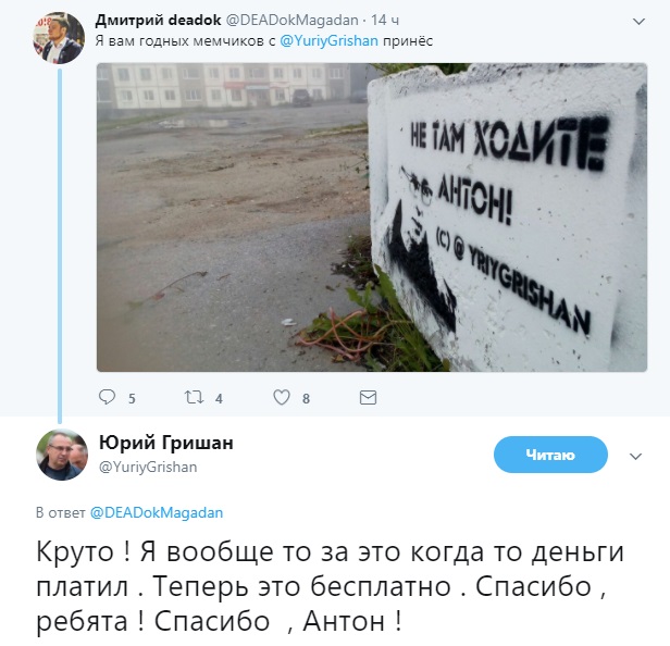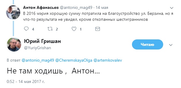 Еще в мае блогер Антон Афанасьев написал в своем твиттере, что в 2016 году мэрия Магадана потратила немалые деньги на благоустройство улицы Берзина, но результата он не заметил. В ответ Юрий Гришан и написал эту фразу "Не там ходишь, Антон".