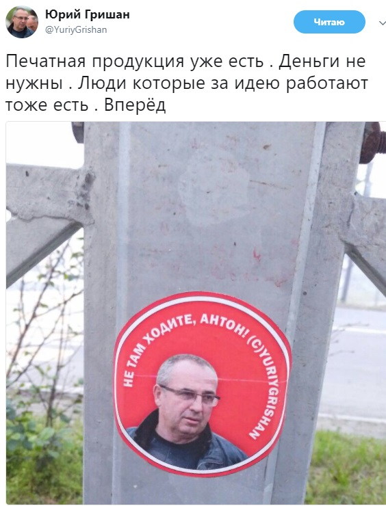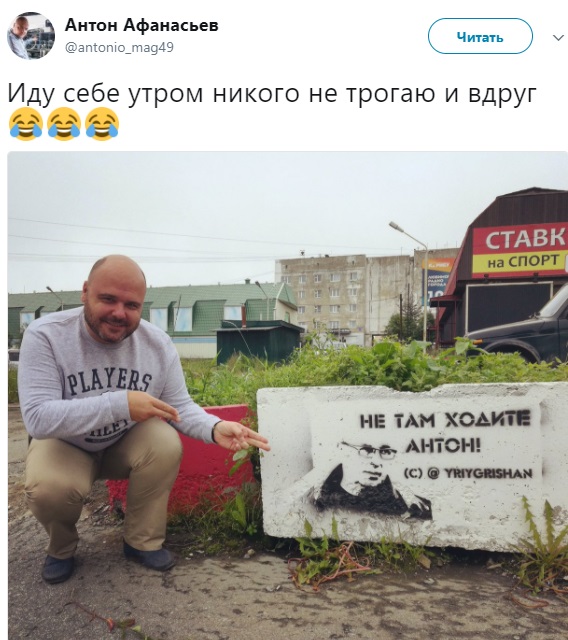 В Магадане на самых разбитых и неблагоустроенных улицах города повсюду внезапно появились спрайты (уличные рисунки, выполненные через трафарет), на которых нарисован мэр города и надпись: "Не там ходите, Антон". Автором этой фразы является глава Магадана Юрий Гришан. А сказал он ее в твиттере, поспорив там с магаданским блогером Антоном Афанасьевым о том, как в городе идут благоустроительные работы.