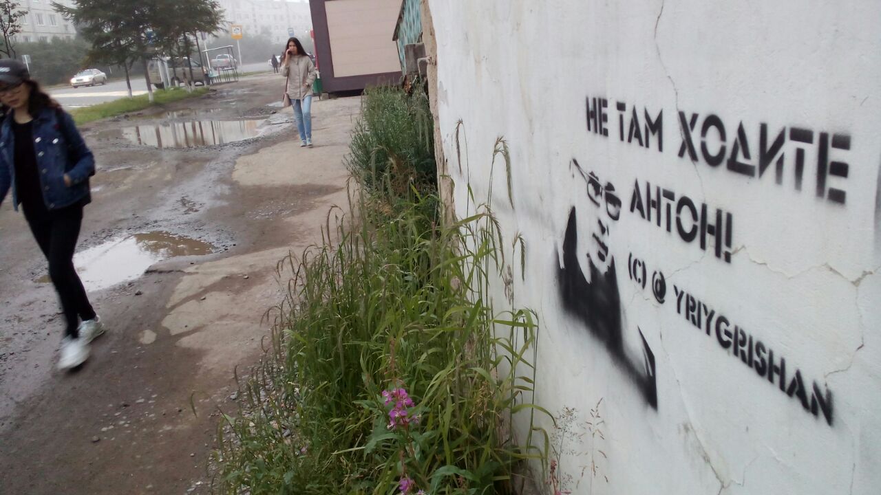 И вот очередная виртуальная дискуссия с блогером о деятельности мэрии получила неожиданный поворот. Местный художник Григорий Сычев нанес граффити со знаменитыми теперь уже "не там ходишь, Антон" на различные объекты в Магадане, которые, по его мнению, нуждаются в благоустройстве. Теперь увидеть высказывание мэра можно и в центре города, и на его окраинах.