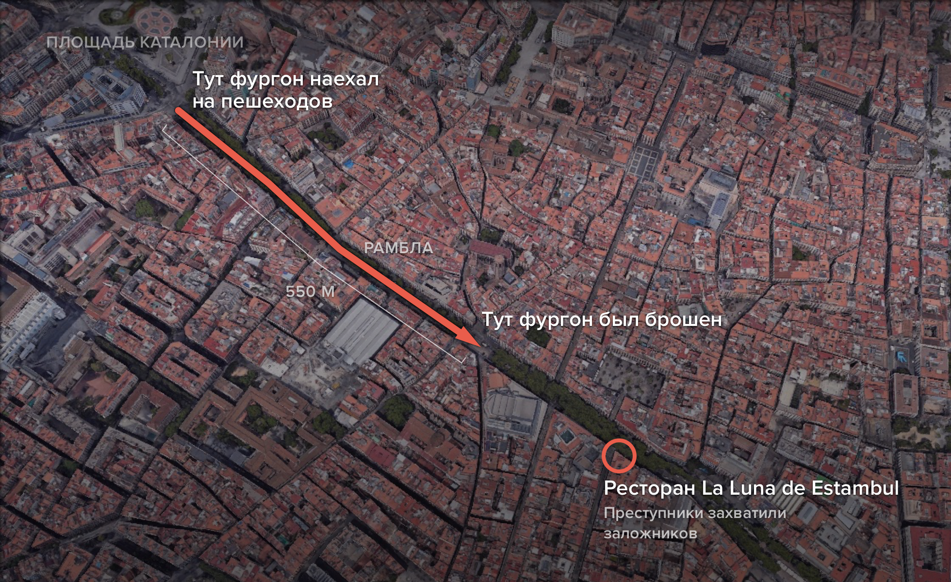 — Фургон на большой скорости сбил несколько десятков пешеходов на главной пешеходной улице Барселоны. Водитель ехал так, чтобы задеть как можно больше людей.