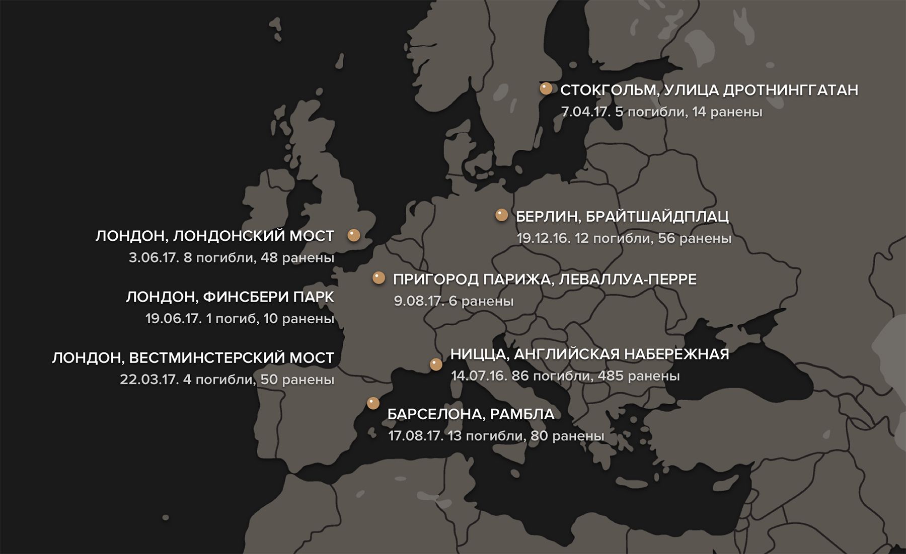 Автомобили как оружие террористов. Восемь нападений в Европе за год. Карта