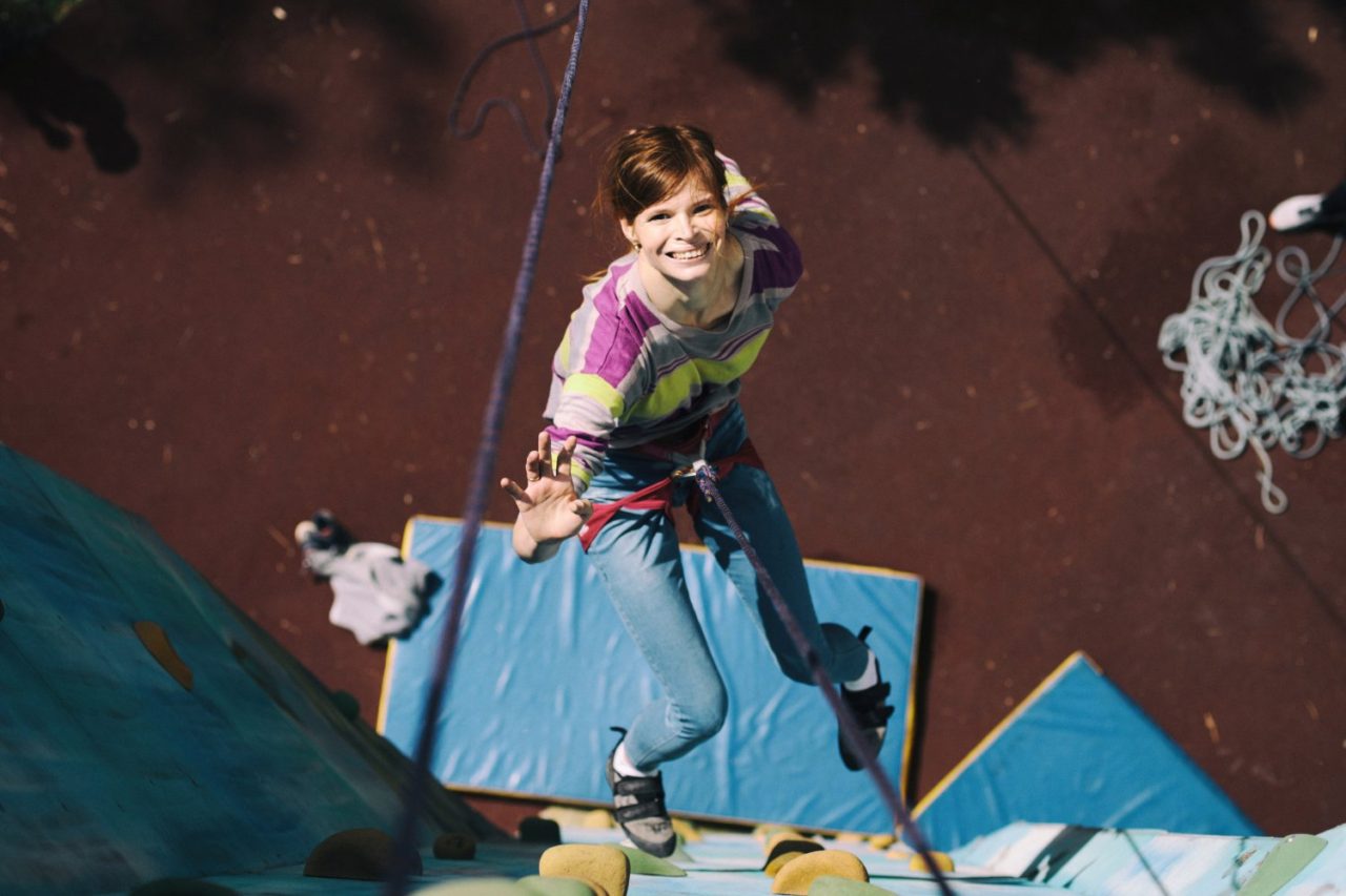 Взгляд девушки устремляется на скалодром, который только что покорила Настя Аброскина. Теперь она спешит опробовать слек-лайн, натянутый на соседней площадке. Ходят слухи, что у людей с ДЦП очень плохо с координацией и вестибулярным аппаратом. Настя Аброскина не планирует их останавливать: слухи пусть ходят, а она пойдет по канату.