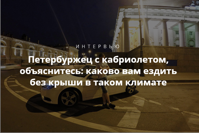 На самом деле, кабриолету вообще не место в Петербурге, ему место где-нибудь в Сочи или Майами, где постоянное солнце. У меня до сих пор в голове вопрос, зачем я привез кабриолет в Петербург. Я давно здесь живу, поэтому прекрасно понимал, что 90 % времени у нас будет дождь, снег и град. Но не пожалел.