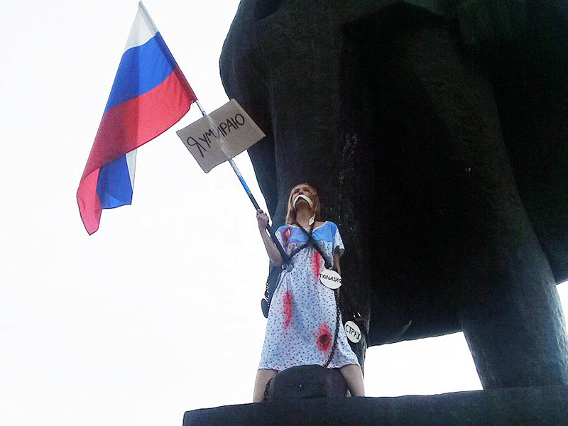 В центре Новосибирска девушка, одетая в ночную рубашку с красными пятнами, символизирующими кровь, приковала себя цепью к памятнику Ленина. В руках она держала российский флаг и табличку "Я умираю", ее рот закрывала повязка, сообщает "Сибкрай.ru". К цепям также были прикреплены картонки со словами "коррупция", "цензура", "полиция" и "страх". С памятника участницу перформанса сняли спасатели, полицейские и представители городской администрации, после чего ее увезли на скорой.