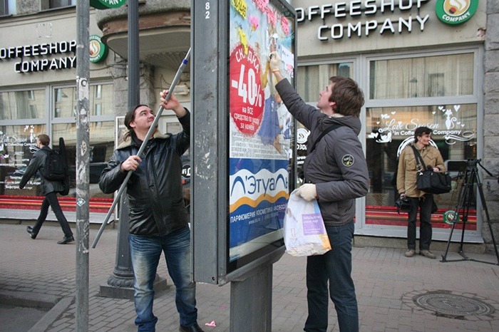 Есть и другой метод борьбы с рекламой — это рейды добровольцев в какой-либо район. Сейчас этим активно занимается «Красивый Петербург»: по словам участников движения, в среднем за один такой поход один активист может сорвать до 300–400 объявлений. Сейчас в организации борьбой с незаконной рекламой занимается 20 человек.