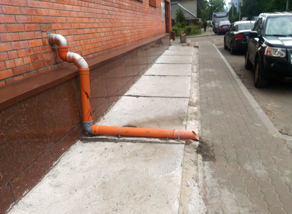 Конечно и это не правильно. В идеале стоки должны идти в канализацию минуя и тротуары, и автодорогу. Всё-таки по лужам ходить как-то не очень. А на дорогах возможно аквапланирование, т.е. потенциально аварийная ситуация. Да и обливание водой пешеходов никто не отменял.