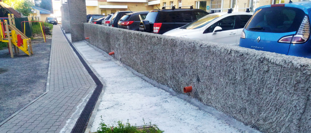 Ещё пример, уже хорошего, но не «додуманного» решения. Новый дом на пересечении Воскресенской и Советских Космонавтов. Вода не льется прямо перед подъездом и парковкой, а выводится к ливневке. С другой стороны последней детская площадка, и если решетки не будут чистится, в хороший дождь тут будет лужа. Что мешало «доделать» и пустить трубы под землей сразу в ливнёвку?