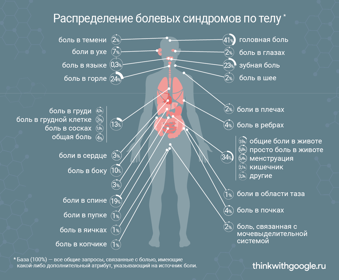 Девять из десяти запросов про боль касаются определенной части тела: головы (35%), тела в целом (56%), ноги (8%), руки (1%). Если речь идет о голове, чаще подразумевается не только мигрень, но и боль в горле, зубная боль, боль в ухе, шее или глазах. С телом чаще всего связаны запросы о боли в животе, спине, груди, боку, реже — в ребрах, почках, сердце и печени.