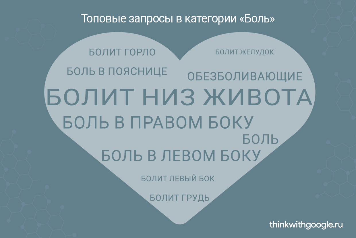 —Фото: Google 75% запросов в категории «боль» исследуют ее причины («почему болит» — 5,5%) или ищут решение («что делать» — 5%, «лечить / как лечить» — 4,9%, «медицина» — 4,5%).