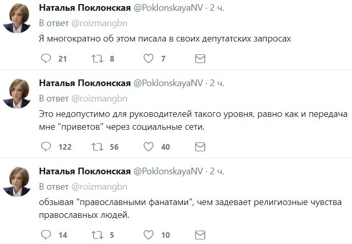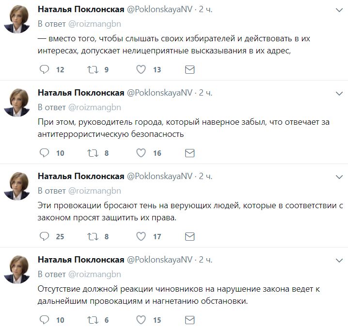 В ответ на свою реплику Ройзман получил от Поклонской целую отповедь в семи (!) твитах: