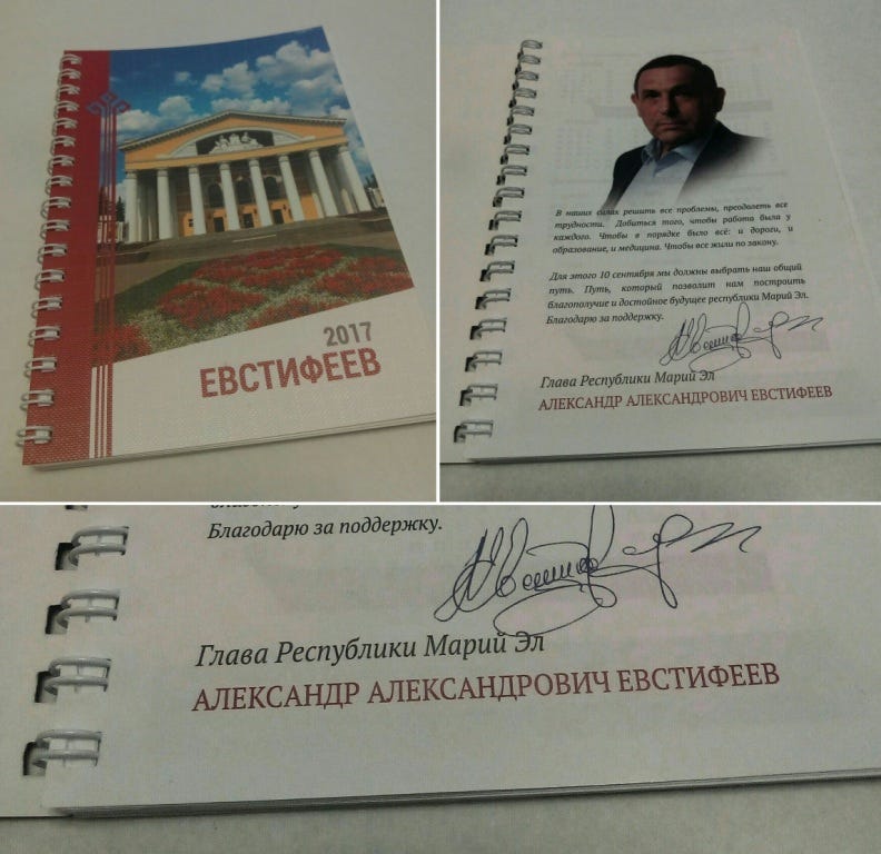 • • К счастью, фишки пока ещё не закончились. По просторам Марийской Республики среди узкого и среднего круга персонажей вручается симпатичный и удобный блокнотик, где Александр Евстифеев представляется “Главой” РМЭ. Нет, ни “Врио Главы” или “Ио Главы”. Даже не обрабатывается лингвистическая уловка “Руководитель”. Конкретно — Глава Марий Эл и автограф. Всё чинно — проплачено с избирфонда. Вот крепкий какой мужик, а? Слово — кремень, сказал — сделал: пришёл, увидел, победил. Шибко заранее победил! Плюнул на обнародование итогов выборов и уже победил. Шутки шутками, но тут и ежу европейскому с тушканчиком мадагаскарским понятно: сам Александр Александрович со своей разноплановой и многоуровневой сверхнагрузкой про мини-ежедневник слышать — не слышал и видеть его — не видел. Это не смесь иронии с сарказмом, а на полной серьёзности. Скорее всего, какой-то “технолог” не удержался и, не дождавшись результатов 10 сентября, в силу циничности или тупости запустил процесс на всю катушку [с юридической точки зрения, термином Глава РМЭ, суть которого разъяснена в региональной конституции, до полноценного избрания характеризоваться, мягко говоря, крайне некорректно]. Фальстарт. Равенство и порядок никто не отменял. Что теперь в рамках закона: срочно останавливать разброс и изымать тиражи? Кто-то из оппозиции ради приличия, показательной независимости и отчётности в Москву обратился в ЦИК? Позже узнается. Дизайнер или типография накосячить не могли, проверка материала не в их ответственности и документы с одобрением на обоих этапах подписывают не они. Ну, да ладно. Они внутри сами разберутся и найдут виноватого образцово-показательного горе-технолога и лишат его места работы за подставу, либо накажут рублём [веселее вместе сразу, не заплатить и уволить — вы приехали и уехали, а нам здесь с семьями жить]… Ok-ok, отныне пельмени с мясом вкусили, опосля закусили маринованными грибочками и заели вяленой рыбой. Что-нибудь осталось? Да, запить ▼