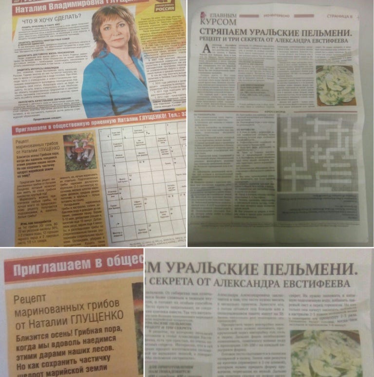 • • Беспартийный Александр Евстифеев в одной из свежих пропагандистских волн приятно удивил. На последней полосе его прессы вышла любопытная статья. Заголовок превосходен — “Стряпаем Уральские пельмени. Рецепт и три секрета от Александра Евстифеева”. Если честно, упомянутое движение показалось неожиданным. Представитель “Справедливой России” Наталья Глущенко в свою очередь тоже решила не отставать. Как-никак, она женщина и мать. Ей лучше знать зачем и что готовить, то есть она разбирается как в кухне политической, так и реальной. В её газете, аналогично на последней странице, была опубликована весомая заметка под интересным названием — “Рецепт маринованных грибов от Натальи Глущенко”. Очень шикарно. Однако кто у кого скомуниздил идею, либо её придумали в одном кабинете, и что вкуснее — пельмени, грибы, либо марийские подкоголи и колбаса-шокта с мясом и кровью — решать вам. На вкус и цвет, как высказываются ▼