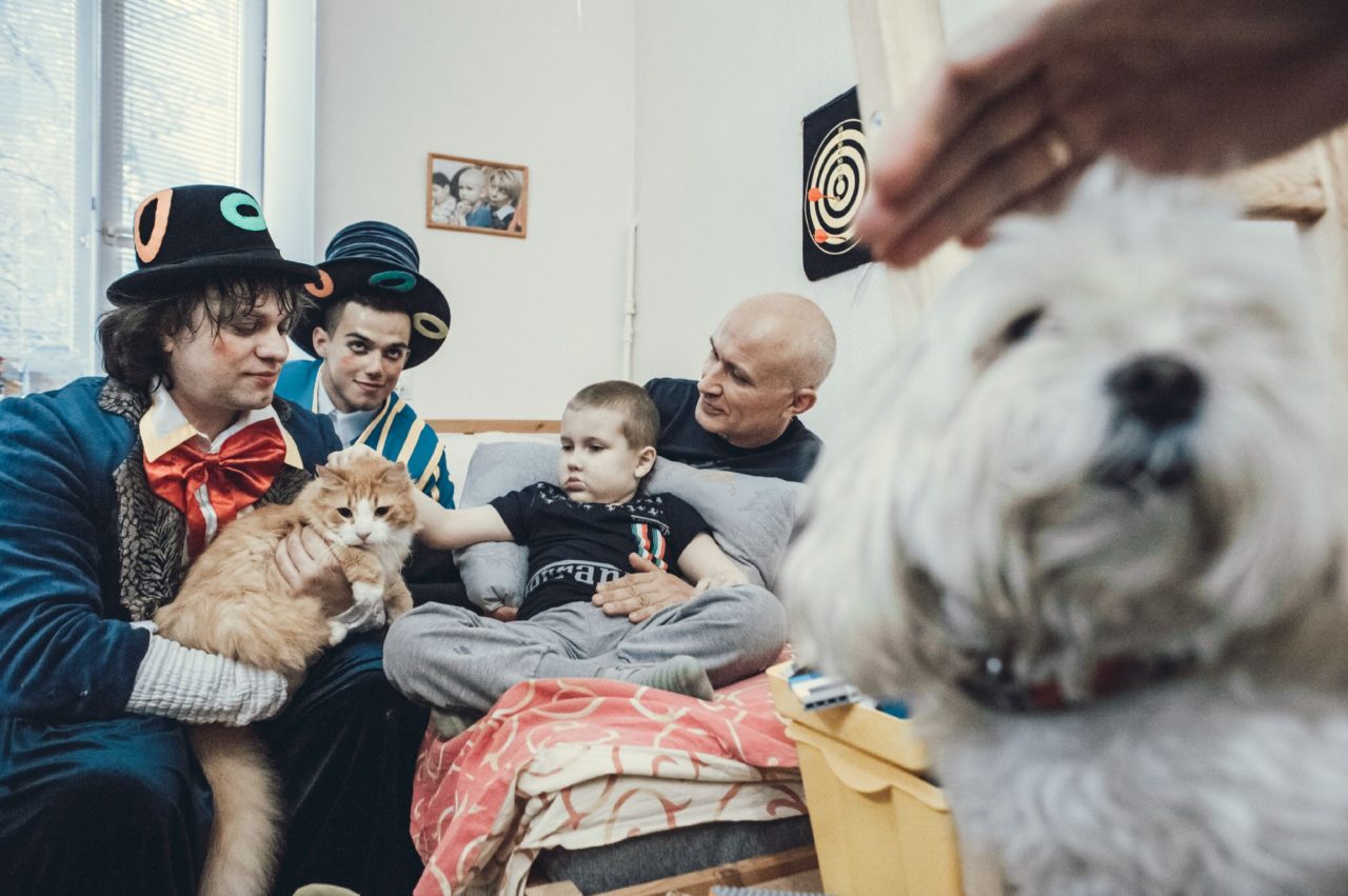 И сегодня в комнатенке, где живет семья Максима, праздник — представление с клоунами и дрессированными животными. В комнату с радостным лаем влетают болонки. Максим тут же бросается их гладить, а они терпеливо подставляют под детские руки то голову, то бок, то живот. Потом помещение наполняется мурчанием — это заносят котов в переносках. Максим просит погладить кошек, по-детски неуклюже хватает их и веселится. Мама шепчет ему на ухо, что кошек надо гладить спокойнее, иначе они могут поцарапать. Максим слушается, потому что мама так сказала, сам же он ничего на свете не боится, подумаешь — поцарапают. К середине представления Максим устает — он что-то шепчет маме на ухо, и на ее лице смесь радости от того, что мечта сына сбылась, и грусти от того, что он так быстро утомился. Тут же в руки Максиму дают самого большого рыжего кота Буслая, главную звезду шоу. Максим гладит его очень аккуратно. Сил как будто становится чуть больше.