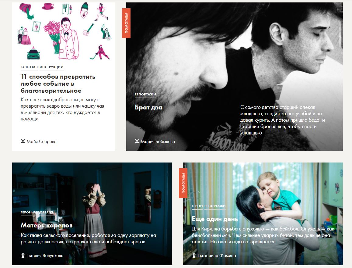 Первая классификация вам уже известна: это «Герои», «Драмы», «Контекст» и «Случаи». Здесь все по-прежнему: в «Героях» мы пишем о тех, кто меняет жизнь вокруг себя, в «Драмах» рассказываем о тяжелых испытаниях и несправедливости, в «Контексте» подробно разбираем те или иные явления реальности, а в «Случаях» изучаем людей с необычной судьбой.