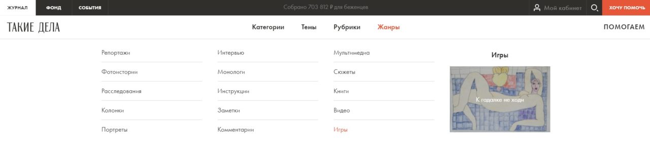 Прежде всего мы переосмыслили главную страницу «Таких дел» — takiedela.ru. По сути, мы создали домашнюю страницу заново, сделав из нее интерактивный журнал. Если раньше материалы просто падали на главную в хронологическом порядке, то теперь ее на протяжении дня вручную собирает выпускающий редактор. Каждый опубликованный нами материал может занимать какую-то часть экрана: одну треть, половину, две трети или всю ширину.