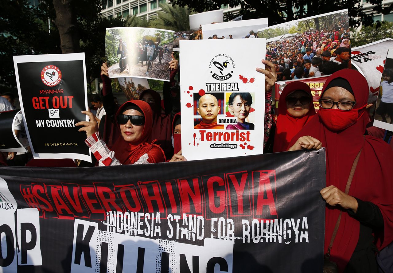 Adi Weda / EPA / Scanpix / LETA Акция в защиту рохинджа в Индонезии, 3 сентября 2017 года