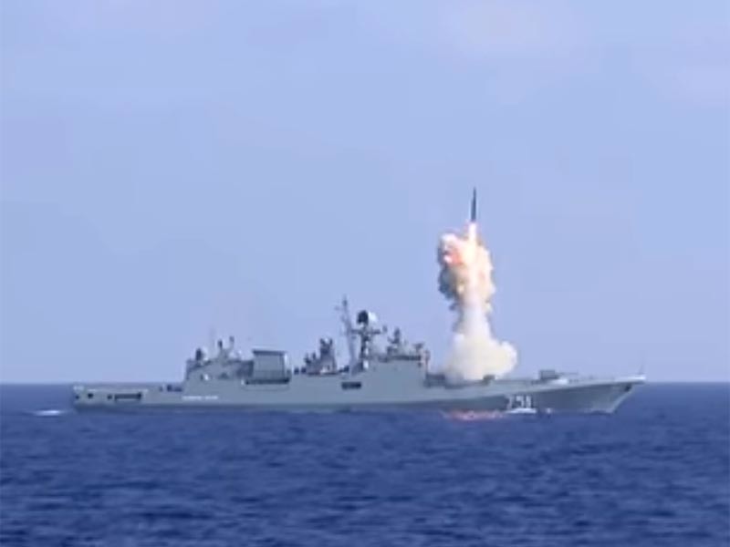 На видеозаписи длительностью в полторы минуты с разных ракурсов показаны пуски трех "Калибров" из пусковых установок фрегата.