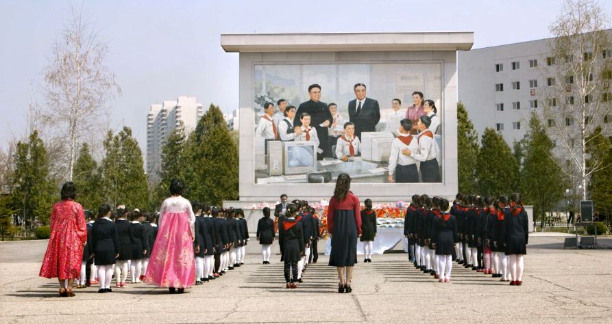 Это церемония приема в пионеры. Вроде бы ничем не примечательная фотография, если бы не контекст. Обычно северокорейских сопровождающих бесполезно о чем-либо спрашивать, они не отвечают на вопросы, но иногда сами что-то рассказывают. Наш сопровождающий вдруг рассказал, что этих детей (стоят по левую руку от сопровождающего) взял на содержание «дорогой лидер», потому что родители этих детей погибли на войне с Америкой. Это съемка 2014 года, а детям тут — 8–9—10 лет. Значит, в 2004 году или чуть позже огромное количество северокорейцев погибло на войне, которой не существует.