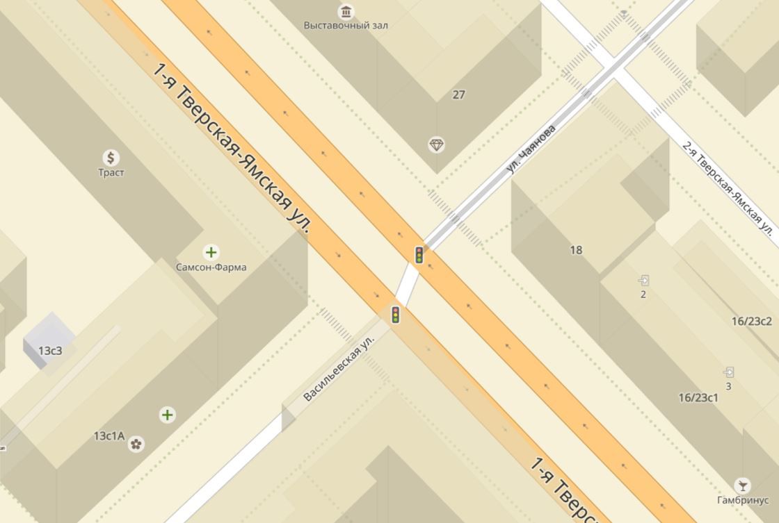 На картах Google и «Яндекс» появился перекресток на пересечении московских улиц Чаянова, Васильевской и 1-й Тверской-Ямской. В реальности перекрестка на этом месте нет — там отсутствуют светофоры, дорожные знаки и разметка. Однако московские водители все равно проезжают через него — их ведет навигатор.