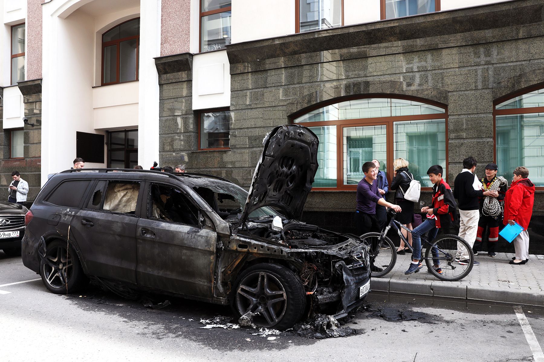 Сожженный автомобиль у офиса адвоката Алексея Учителя. Фотография
