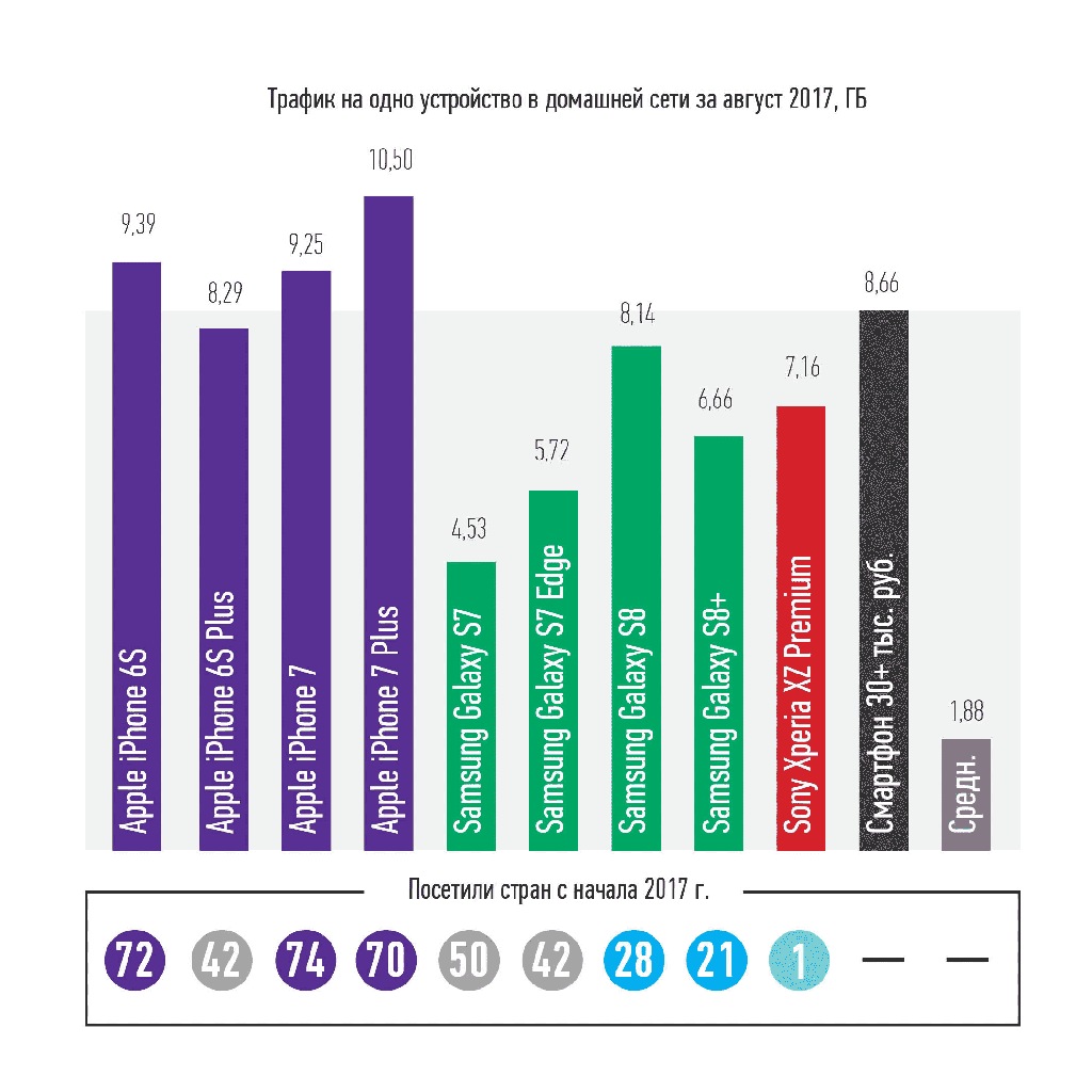 Абоненты, которые пользуются iPhone 7 Plus с увеличенной диагональю экрана, потребляют больше трафика, чем владельцы других iPhone. Для дорогих моделей Samsung это правило не работает — стандартный GalaxyS8 «качает»в 1,2 раза больше, чем GalaxyS8 Plus с более крупным дисплеем.