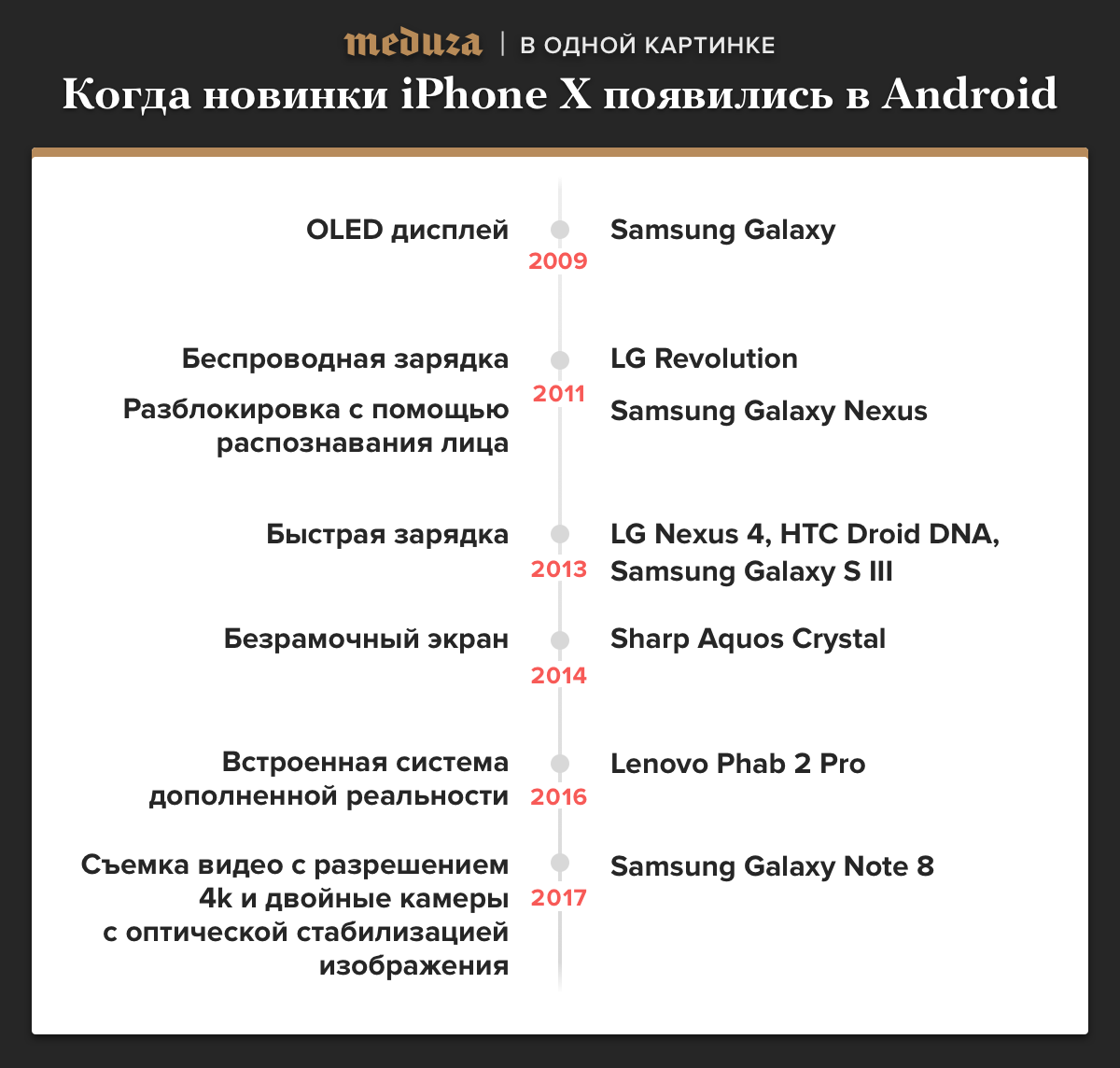 Apple представила телефон iPhone X с новым дизайном и функциями. Журналисты обратили внимание, что многие нововведения в том или ином виде уже появлялись в различных телефонах на операционной системе Android.