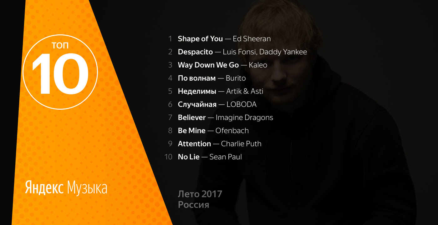 В тройке лидеров: песня Эда Ширана Shape of You, хит Despacito Луиса Фонси и Daddy Yankee, а также композиция Way Down We Go группы Kaleo.