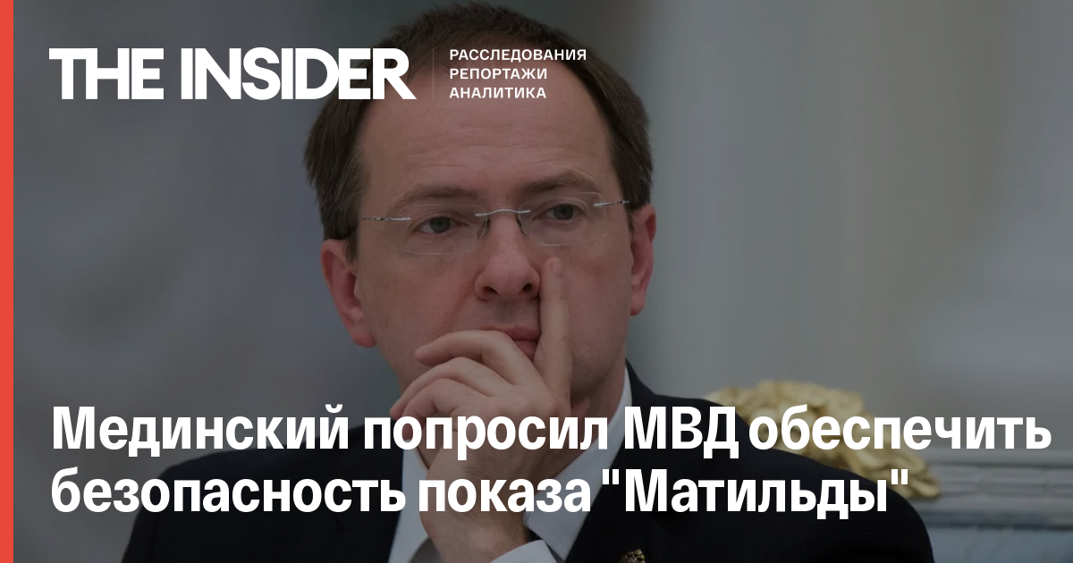 Министр культуры России Владимир Мединский направил письмо главе МВД Владимиру Колокольцеву с просьбой обеспечить безопасность и пресечь возможные противозаконные действия на показе фильма «Матильда». Об этом сообщает «Интерфакс».
