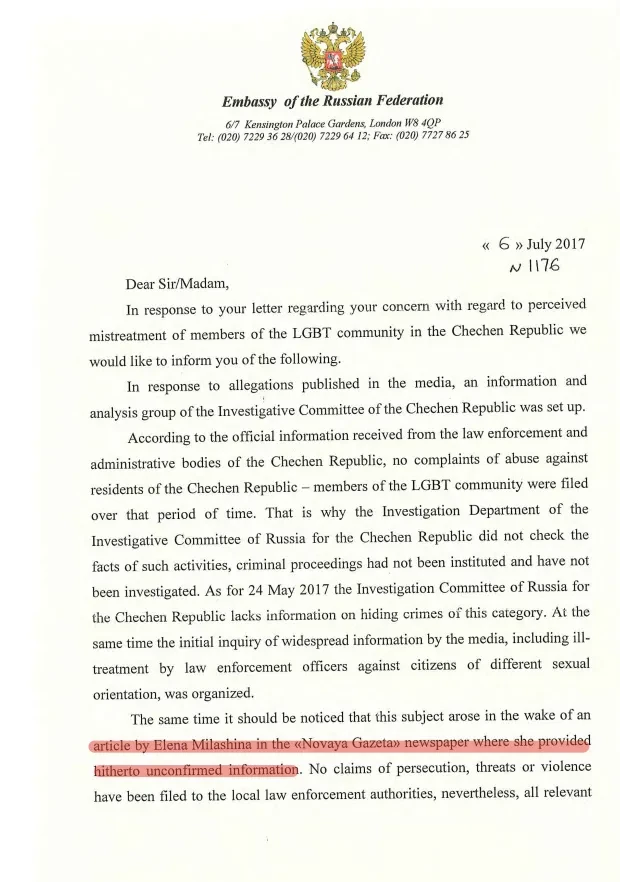 Понимая, насколько слаба такая аргументация, МИД пошел даже на серьезное нарушение и, по сути, предрешил исход доследственной проверки, санкционированной Кремлем после публикаций «Новой газеты». Так, в ответе российского посольства в Великобритании на запрос международной правозащитной организации Amnesty International утверждается: «Голословные обвинения Милашиной о преследовании геев в Чечне не нашли подтверждения <в ходе расследования> федеральными силовыми структурами».
