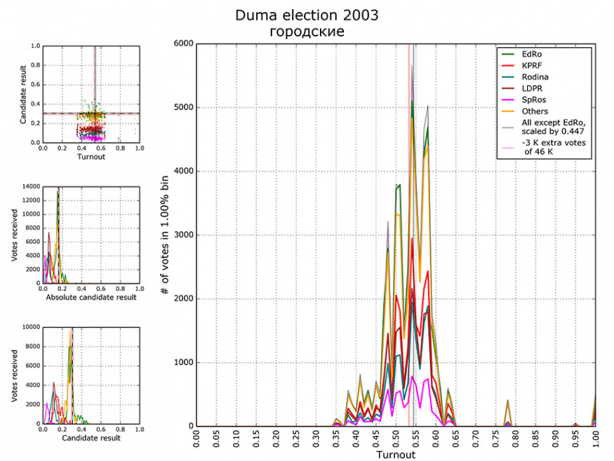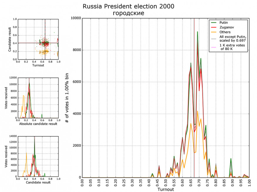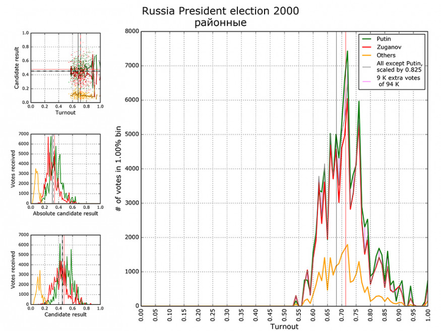 — Выборы президента России в 2000 году выглядят идеально: явка в районах чуть больше городской, ширина распределения тоже больше, но не сильно. То же самое и в 2003 году.
