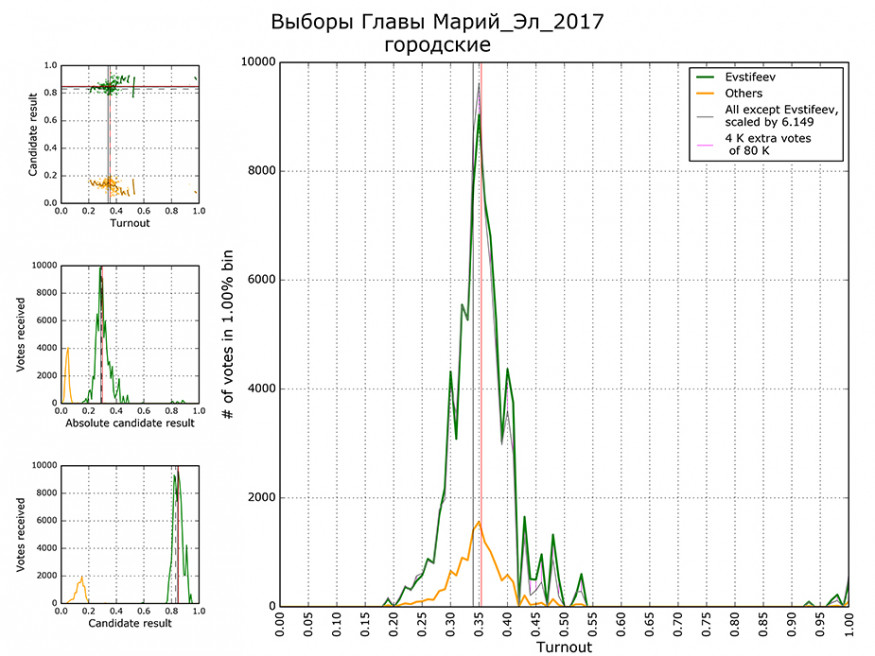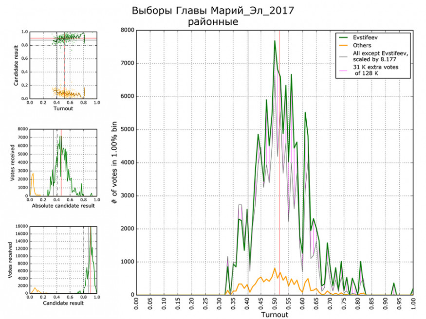 Изучив данные явки в 16 регионах, где выбирали губернаторов, аналитик написал, что без фальсификаций прошло голосование в Карелии и Севастополе. По поводу Марий Эл он сделал вывод, что искажений было больше, чем во время думских выборов, а реальная явка ниже примерно на 12%: